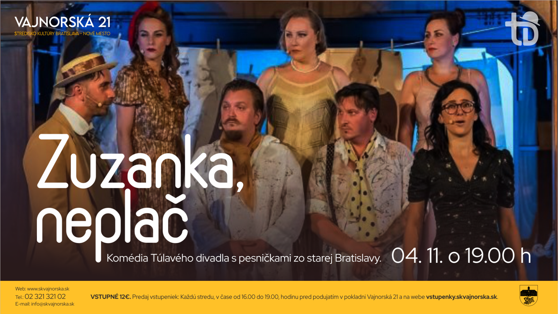Zuzanka, neplač je komédia Túlavého divadla s výnimočným hereckým obsadením v podobe Števa Martinoviča, Lucie Hurajovej a mnohých ďalších. Okrem skvelých hercov navyše plná pesničiek, ktoré voňajú dobou, akoby ich priniesol sám František Kryštof Veselý.