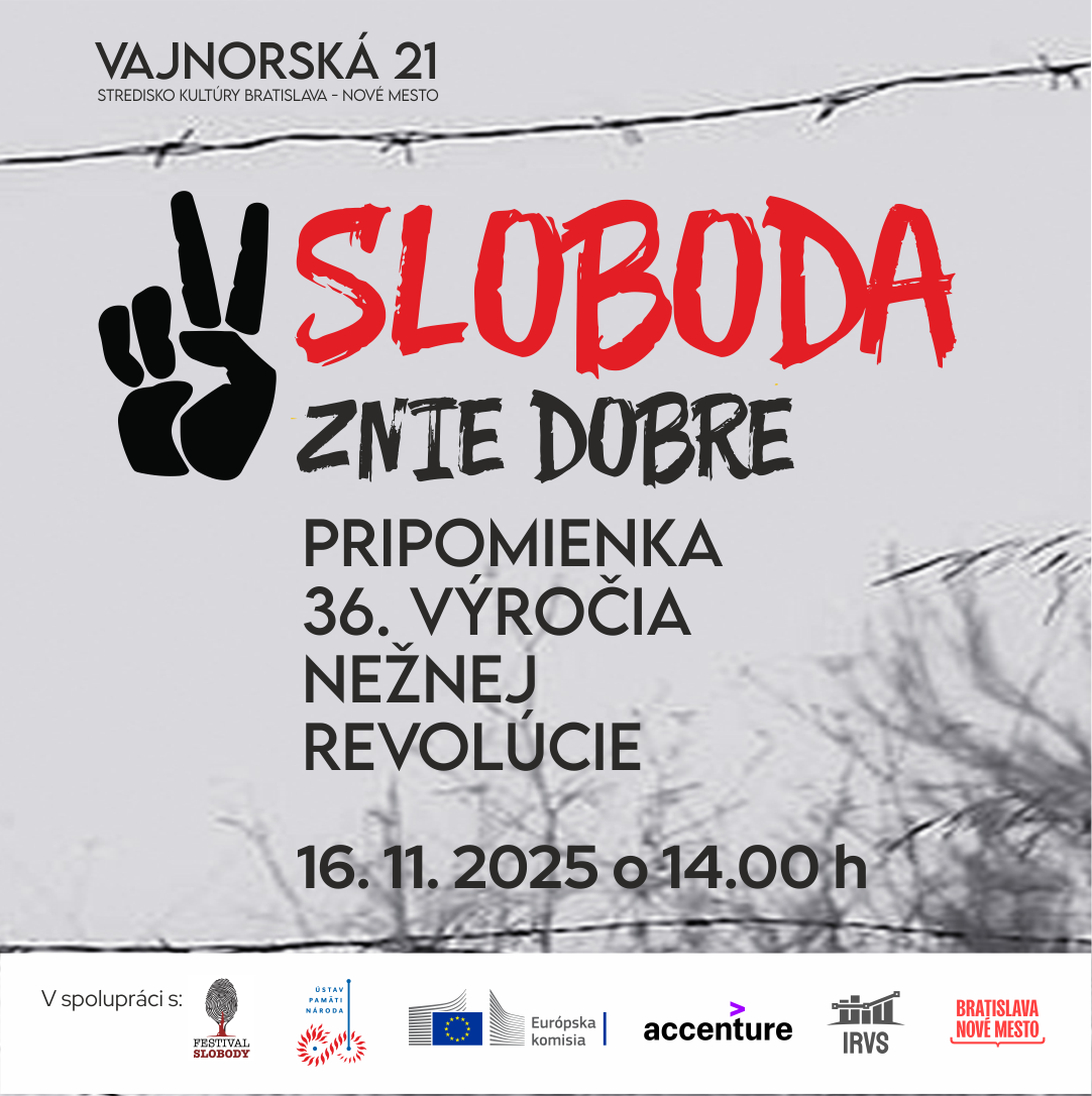 Ak milujete slobodu rovnako ako my, príďte si k nám v nedeľu, 16. novembra od 14.00 pripomenúť 36. výročie Nežnej revolúcie. Pod hlavičkou Festivalu slobody a v spolupráci s Ústavom pamäti národa, Zastúpením Európskej komisie na Slovensku, spoločnosťou Accenture, Inštitútom rozvoja verejnej správy a mestskou časťou Bratislava - Nové Mesto sme pre vás pripravili program plný diskusií, koncertov, inšpiratívnych hostí, aj sprievodných aktivít.