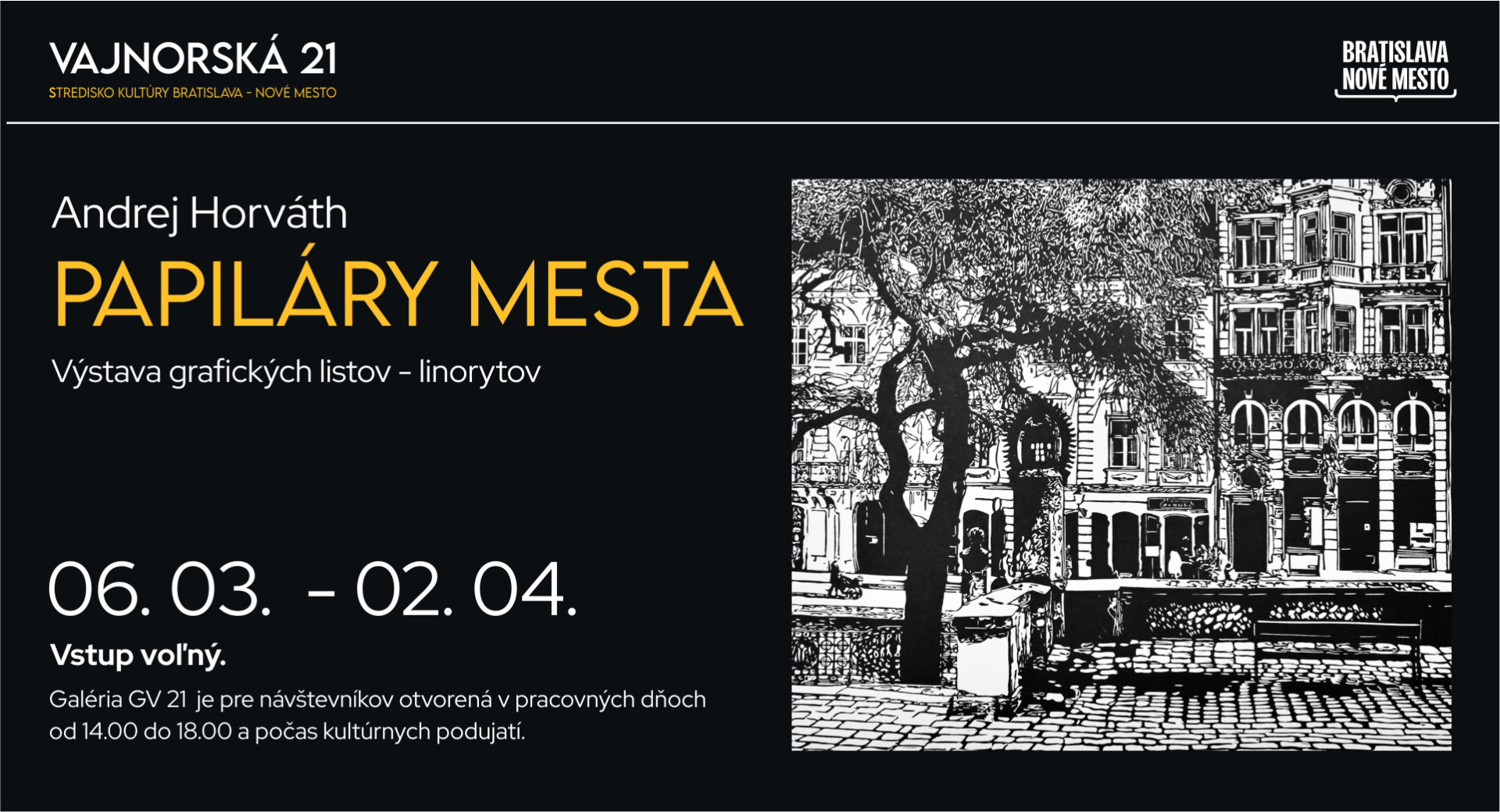 Predajnú výstavu v Galérii GV 21 si návševníci môžu pozrieť od 06.03. do 02.04, v pracovných dňoch od 14.00 do 18.00 a počas kultúrnych podujatí.